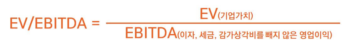 기업의 가치를 이자, 세금, 감가상각비를 빼지 않은 영업이익으로 나눈 값으로 EV/EBITDA의 공식은 다음과 같습니다. 만약 EV/EBITDA가 3배라고 할 경우 그 기업의 가치(EV)에 해당되는 가격이 그 기업이 벌어들이는 이자, 세금, 감가상각비를 빼지 않은 영업이익(EBITDA)의 3배라는 의미로써 3년동안 기다리면 투자원금 회수가 가능하다는 의미입니다. 즉, 'EV만큼 투자할 경우 투자원금을 회수할 수 있는 기간이 얼마나 걸리느냐'가 EV/EBITDA라고 할 수 있습니다. 공식은 아래와 같습니다.