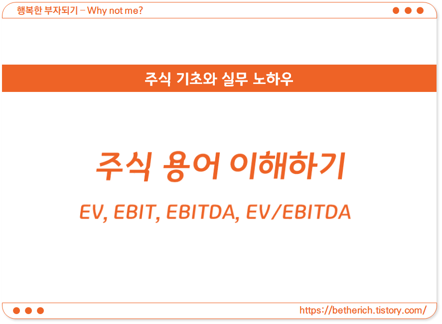 새로운 개념에 대하여 공부해 보려고 합니다. EV, EBIT, EBITDA, EV/EBITDA(보통 읽을 때 '이비 에비따'라고 많이 읽더라구요.) 발음하기도 어려운 이 용어들이 도대체 무엇인지 한 번 알아보겠습니다.