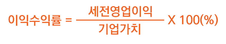 기업가치와 비교해 해당기업이 돈을 얼마나 버는지를 나타내주는 지표입니다. 해당 공식은 다음과 같습니다.