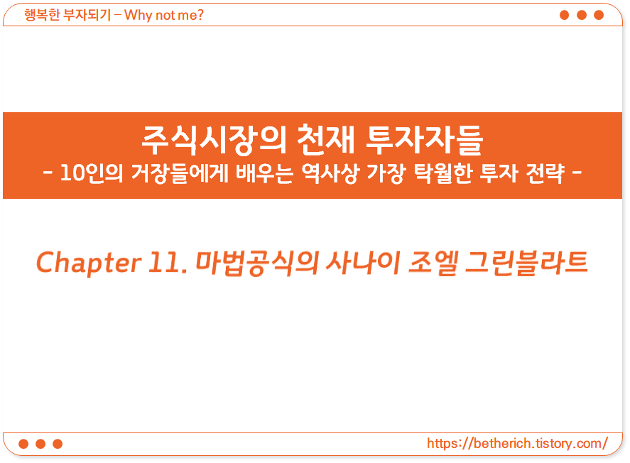 조엘 그린블라트는 '진짜 시장을 이기기 위해 전문가나 학자는 아무런 도움이 되지 않는다.', '자기 스스로 해봐야 한다.'라는 점을 강조했습니다. 화려한 공식과 휘황찬란한 논리를 내세울 필요도 없고 복잡하게 생각할 필요도 없다. 이것이 왜 타당한지를 스스로 이해하면 되고, 그러기 위해서는 몇 개월 동안 하루에 몇 분 정도씩만 투자하면 된다고 했습니다. 그리고 놀라울 정도로 단순한 방법을 조엘 그린블라트는 '마법공식'이라고 이름붙였습니다.