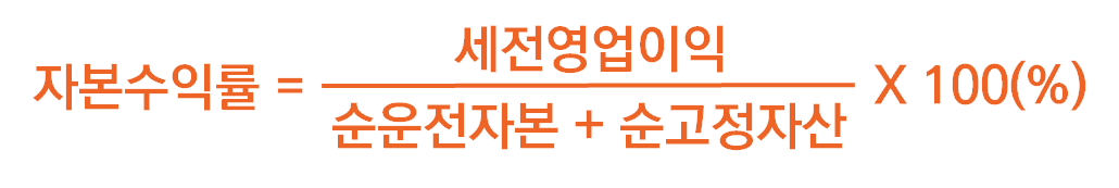 기업이 자본으로 돈을 얼마나 버는지를 보여주는 개념입니다. ROIC라고도 하며 해당 공식은 다음과 같습니다.