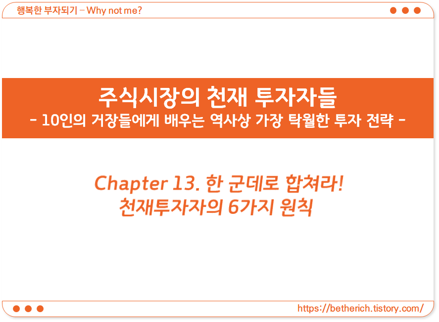 10명의 천재투자자들의 투자전략과 종목 선정법 등에 대하여 공부했습니다. 각자만의 이론을 토대로 중요시하는 지표들도 있었지만 대부분의 천재투자자들이 공통적으로 주장했던 것들은 비슷했습니다. 그리고 이 책의 저자인 John P. 리즈는 10명의 천재투자자들의 모델을 어떻게 활용하면 되는지에 대한 6가지 원칙을 제시하고 있습니다.