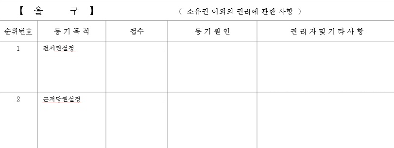 소유권 이외의 권리(제한물권) 관련사항을 나타냅니다. 근저당권, 전세권, 임차권, 지상권, 지역권 설정 관련 내용을 알 수 있습니다.