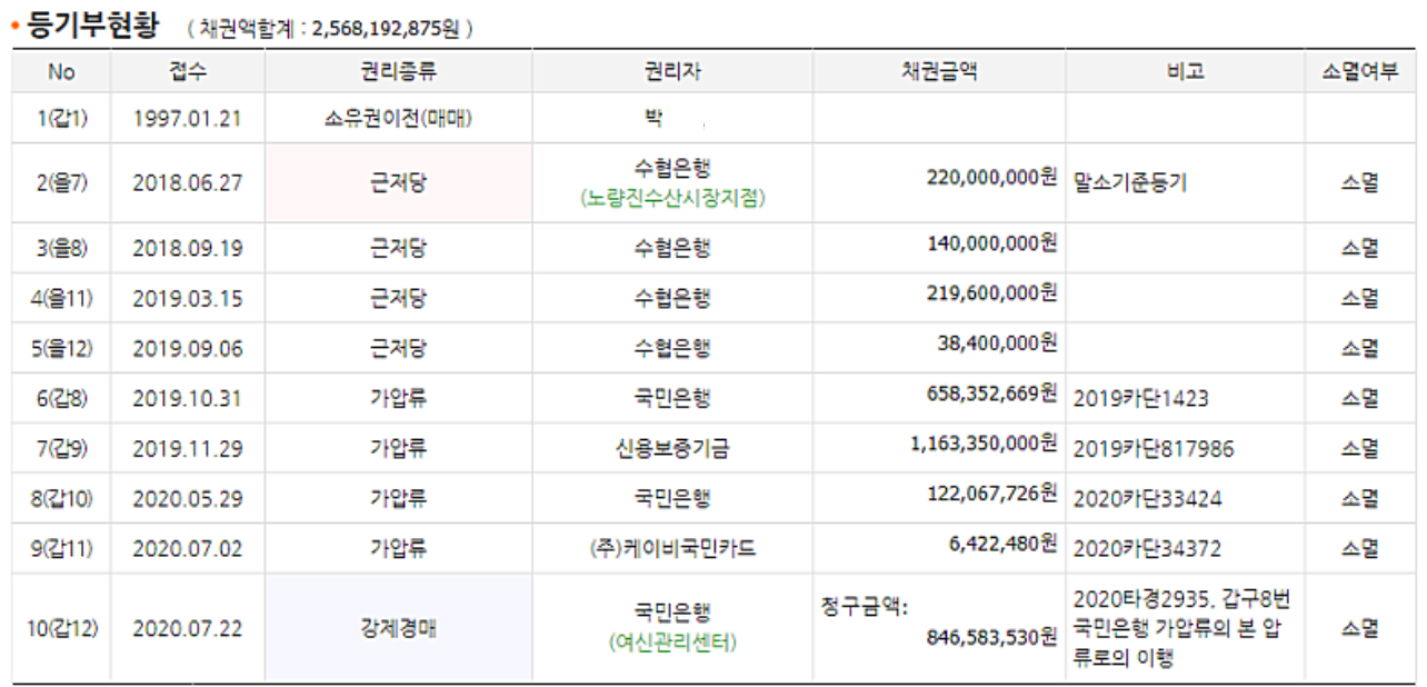 | 2019.05.04 가압류 2019.07.21 근저당 2019.09.23 담보가등기 |