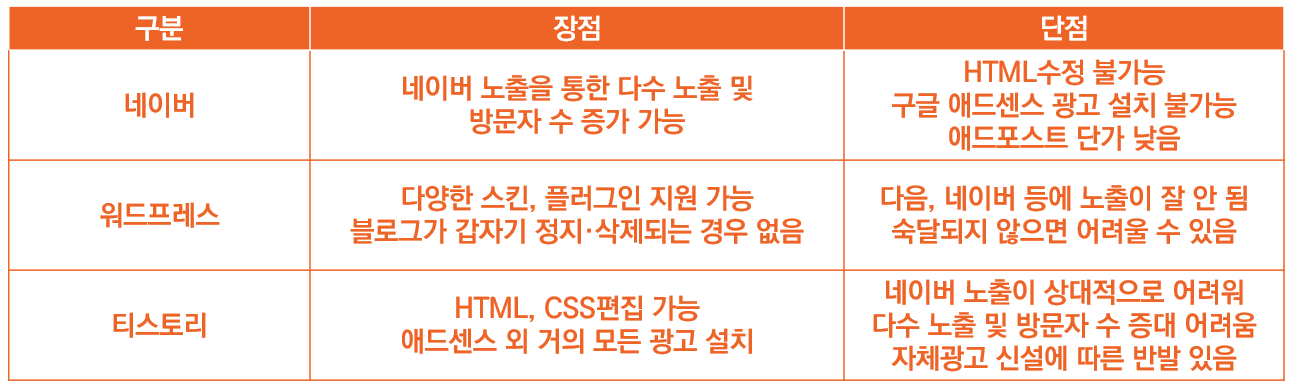 만약 이 질문에 대한 답이 정해져 있다면 모든 사람들은 해당 블로그 서비스만 이용할 것입니다. 하지만 네이버를 이용하는 사람도 있고, 티스토리를 이용하는 사람도 있으며 워드프레스를 이용하는 사람들도 있고, 구글 블로그를 이용하는 사람도 있습니다. 정답은 '어떤 것을 목적으로 하며 어떻게 블로그를 운영하는가?'에 따라 각기 다르다는 것입니다. 그리고 사람들이 많이 이용하는 네이버, 티스토리, 워드프레스 블로그 서비스별 장점과 단점을 아는 것이 필요할 것 같으며, 요약하면 아래 그림과 같습니다.