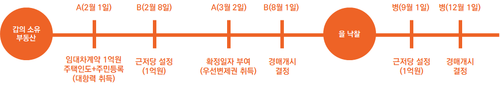 | 갑에게 소유권이 인정되는 부동산에 갑과 A가 2월 1일 임대차 계약을 체결하고 A는 보증금 1억에 대한 임차권을 설정했습니다. 그리고 집에 들어오며 주택인도와 주민등록을 실시했습니다. 그리고 2월 8일 갑은 부동산을 담보로 B은행에 대출을 받았고 B은행은 근저당 1억 원을 설정했습니다. 또한 A는 3월 2일 주민센터에 가서 확정일자를 부여받았습니다. 그리고 갑이 돈을 갚지 않아 B은행은 8월 1일 경매를 신청하였고, A는 자신의 보증금을 지키기 위해 배당요구를 했습니다. 그리고 경매에서는 을이라는 사람이 1.4억원에 낙찰을 받았습니다. 그런데 을이 낙찰을 받으면서 병 은행에 근저당을 설정했고, 을이 돈을 갚지 않으니 병 은행은 다시 이 부동산에 대한 경매를 신청합니다. |