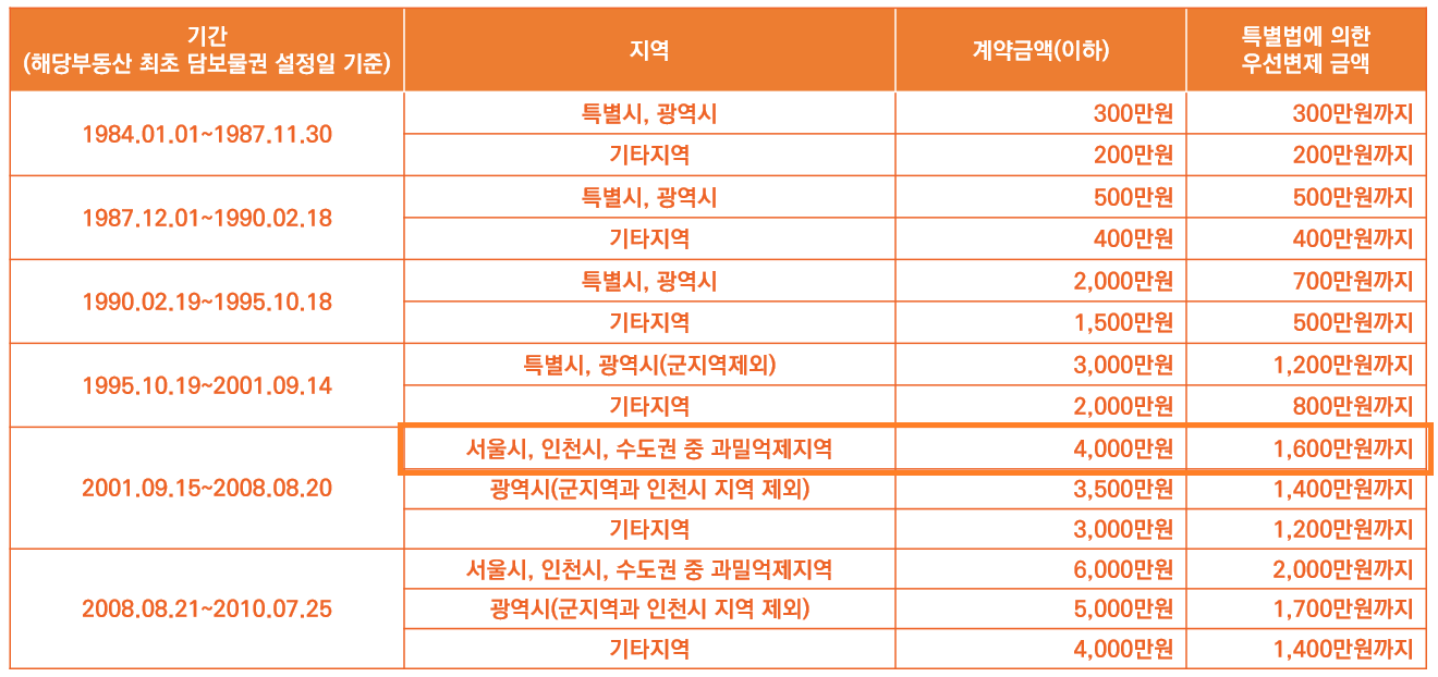 일단 이 집에 최초로 담보물권이 설정된 때는 2002년 4월 20일 설정된 근저당입니다. 해당 일자의 소액임차보증금 기준표를 살펴보겠습니다. 인천광역시의 경우 보증금 4,000만원 이하 계약했을 때 1,600만원까지 최우선변제를 해 준다고 되어 있습니다.