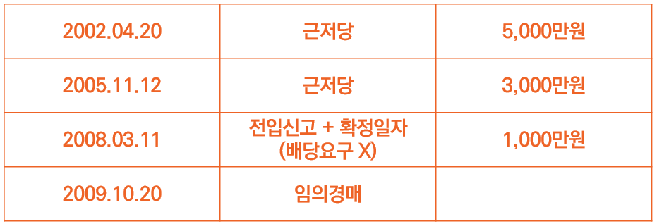 | <예시3> 인천지역의 한 주택에 2002년 4월 20일 근저당 5,000만원이 설정되어 있고, 2005년 11월 12일 근저당 3,000만원이 설정되어 있습니다. 이런 집에 병이 보증금 1,000만원의 임대차계약을 체결하고 2008년 3월 11일 전입신고를 하고 확정일자를 받았습니다. 그리고 이 집이 임의경매에 들어갈 것이라는 소리를 들었으나 별도로 배당요구는 하지 않았습니다. 그리고 2009년 10월 24일 이 집이 임의경매로 넘어갔습니다. |