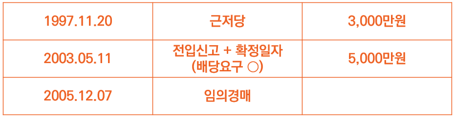 | <예시1> 서울지역의 한 주택에 1997년 11월 20일 근저당이 설정되어 있습니다. 이 집에 갑이라는 사람이 2003년 5월 11일 보증금 5,000만원의 임대차 계약을 체결하고 전입신고를 하고 확정일자를 받았습니다. 그리고 이 집이 곧 경매에 넘어갈 것이라는 소리를 듣고 법원의 배당요구종기일 이전에 배당요구도 했습니다. 그리고 2005년 12월 7일 이 집이 임의경매로 넘어갔습니다. |