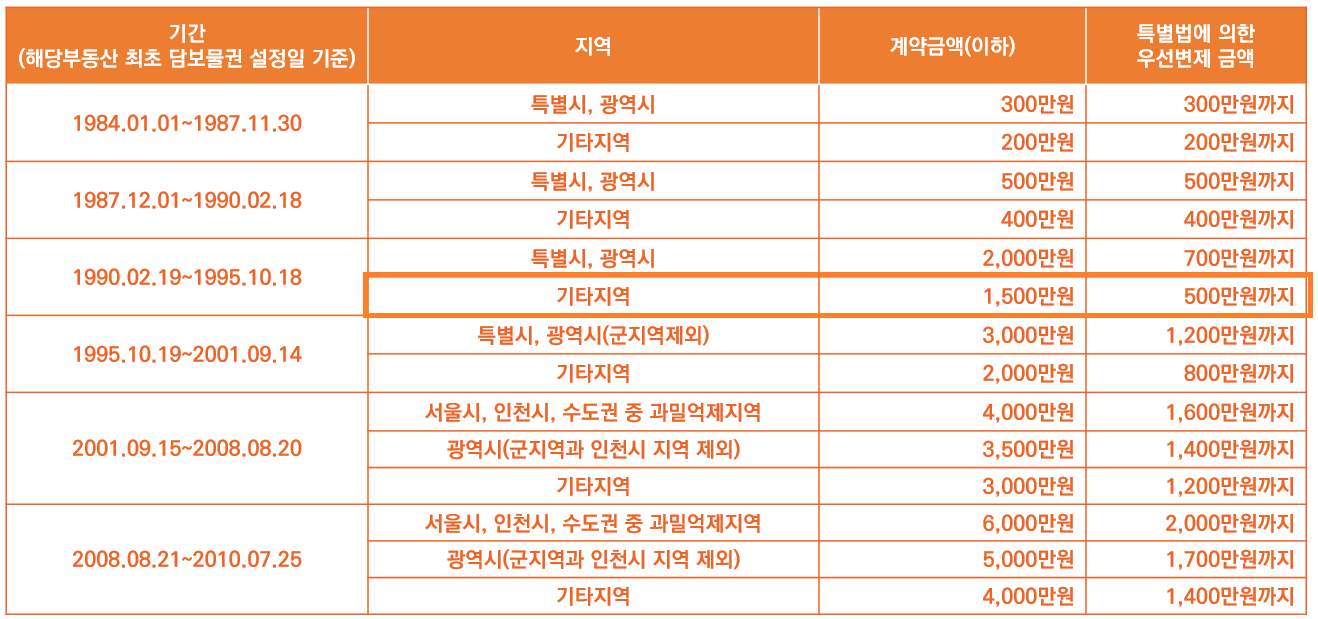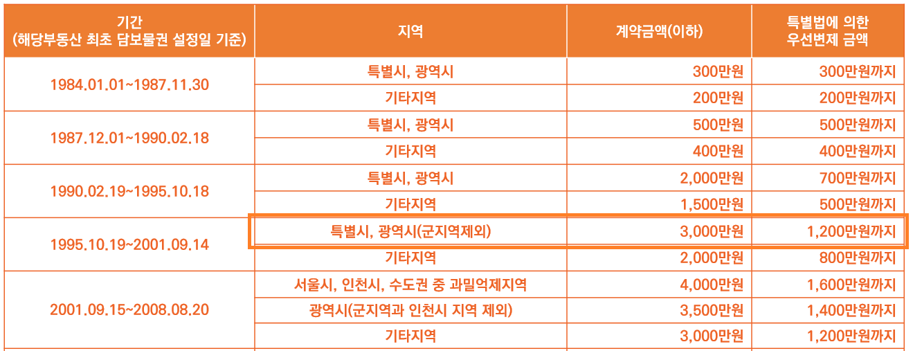 일단 이 집에 최초로 담보물권(근저당)이 설정된 때가 1997년 11월 20일입니다. 해당 일자의 소액임차보증금 기준표를 살펴보겠습니다. 서울특별시의 경우 보증금 3,000만원 이하 계약했을 때 1,200만원까지 최우선변제를 해 준다고 되어 있습니다.