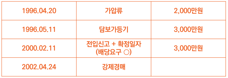 | <예시2> 부산지역의 한 주택에 1996년 4월 20일 가압류 2,000만원이 설정되어 있고, 1996년 5월 11일 담보가등기 3,000만원이 설정되어 있습니다. 이런 집에 을이 보증금 3,000만원의 임대차계약을 체결하고 2000년 2월 11일 전입신고를 하고 확정일자를 받았습니다. 그리고 이 집이 강제경매에 들어갈 것이라는 소리를 듣고 법원의 배당요구종기일 이전에 배당요구도 했습니다. 그리고 2002년 4월 24일 이 집이 임의경매로 넘어갔습니다. |