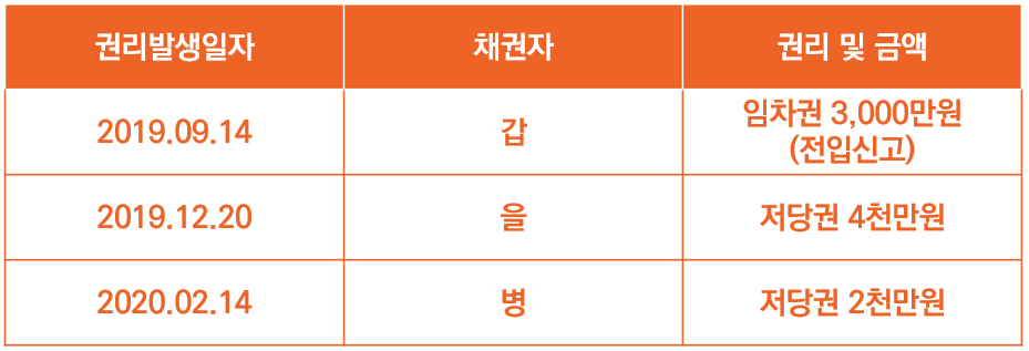 앞서 물권과 채권 간에는 언제나 물권이 우선이라고 공부했습니다. 여기서 임차권은 채권입니다. 그리고 저당권은 물권입니다. 그러면 물권이 채권보다 우선이고, 물권 상호간의 우선순위는 무조건 시간 순서이기 때문에 가장 먼저 을이 4천만원을 배당받습니다. 그리고 병은 2천만원 중 1천만원만 배당받습니다.(4천만원+1천만원=5천만원) 그러면 임차권을 가지고 있는 갑은 자신의 보증금을 한 푼도 배당받지 못합니다.
