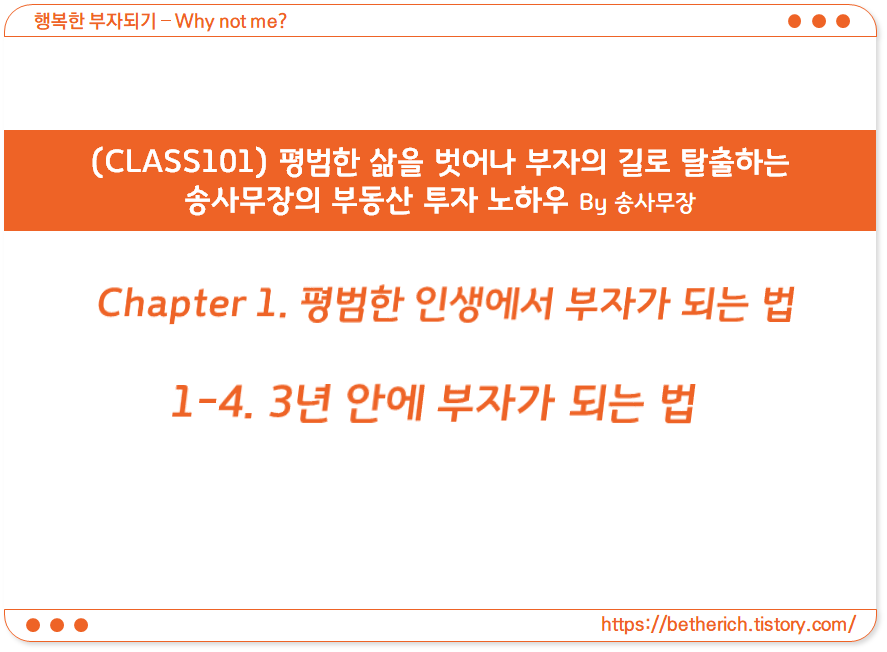 송사무장님은 '3년 안에 부자가 되는 방법'에 대하여 크게 3가지를 제시하고 있습니다. 사실 3년이 길게 생각될 수도 있습니다. 하지만 3년을 투자해서 30년, 그 이상을 여유 있게 살 수 있다고 하면 분명히 시도해 볼 만한 가치가 있다고 생각합니다.
