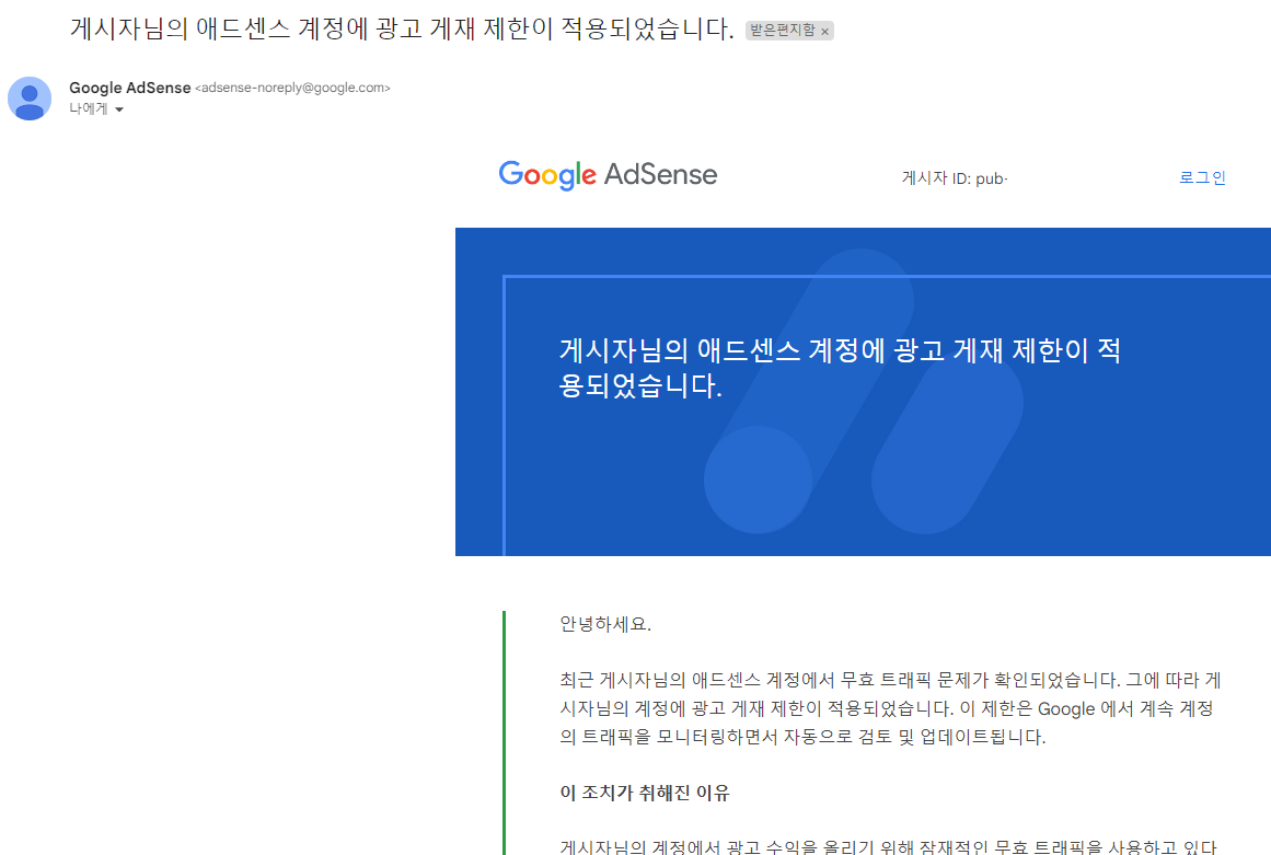하지만 가끔씩 애드센스에서 '게시자님의 애드센스 계정에 광고 게재 제한이 적용되었습니다'라는 메일을 받을 때가 있습니다.