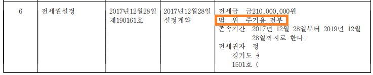 혹시라도 전세권이 주택 전체에 설정된 것인지 일부에만 설정된 것인지 확인해 보겠습니다. 전세권이 말소기준권리가 되어야 낙찰받고자 하는 입장에서는 해당 권리를 인수하지 않아도 되기 때문입니다. 확인해 보니 '주거용 전부'라고 명시되어 있습니다. 그러므로 전세권이 말소기준권리가 아닙니다.