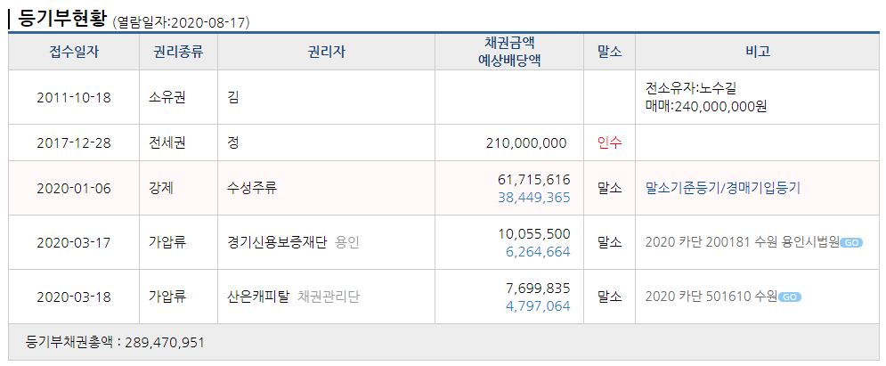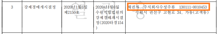 그래서 한 번 확인해 보겠습니다. 등기부등본을 열어 확인해 보겠습니다. 먼저 경매를 신청한 사람이 전세권자인지 다른 채권자인지 확인해 보겠습니다. 확인해 보니 주식회사 수성주류에서 강제경매개시신청을 했음을 확인했습니다. 때문에 전세권이 말소기준권리는 아님을 확인했습니다.