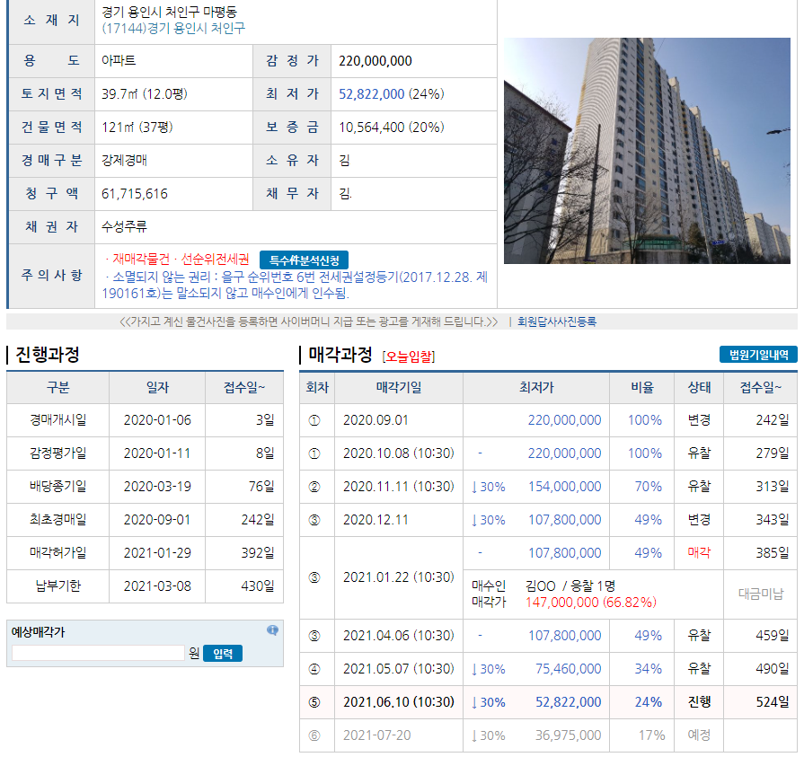경기 용인시 소재 모 아파트입니다. 2020년 1월 기준 감정평가는 2억 2천만원이고, 이게 보니 꽤나 유찰이 많이 되었습니다. 매각이 한 번 되었으나 대금 미납으로 또 다시 경매에 들어갔고 지금까지 진행이 안 되는 걸 보면 사연이 있는 물건 같습니다. 일단은 해당 물건의 소재지나 용도, 물건의 기본정보나 진행과정, 매각과정 등을 한 번 살펴봤습니다.