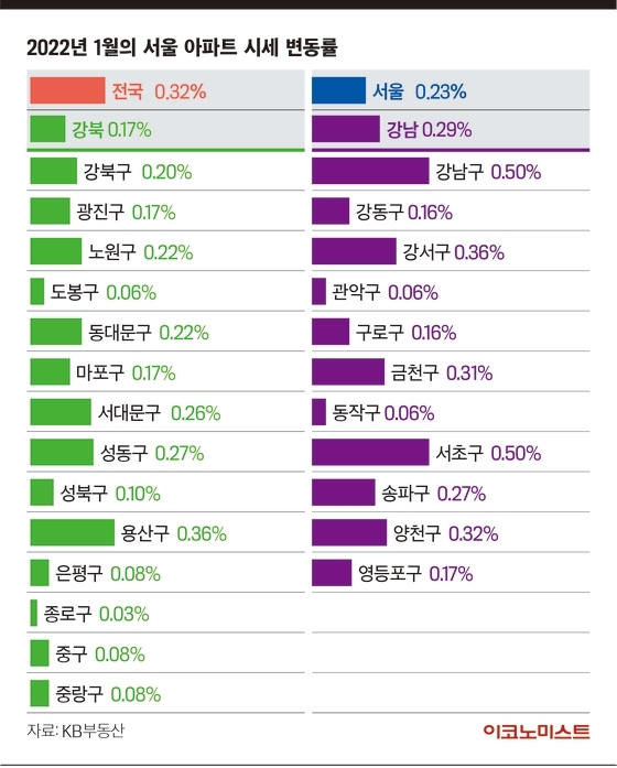 KB 월간 부동산 시황 자료에 따르면 월간으로는 서울 25개구 중 하락지역이 없다.