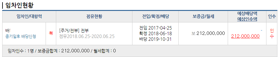 임차인의 대항력(2017년 4월 26일 0시), 우선변제권(2018년 6월 18일)은 근저당권(2018년 12월 21일)보다 선순위입니다. 그렇게 되면 배XX씨의 임차보증금은 고스란히 낙찰자가 인수해야 합니다. 만약 하루 차이로 배XX씨가 배당요구를 했다면 선순위 임차인이 되어 보증금 전액을 우선변제받을 수 있었을 것입니다. 그러면 보증금 212,000,000원에 대한 배당이 우선적으로 이루어지고 나머지 돈으로 근저당권부터 배당이 이루어졌을 것입니다. 그리고 가압류는 안타깝지만 배당을 못 받는 식으로 진행되었을 겁니다.