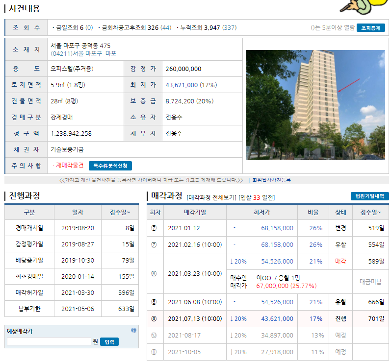 서울시 공덕동 소재 모 오피스텔입니다. 2019년 8월 기준 감정평가는 2억 6천만원이고, 이것도 보니 꽤나 유찰이 많이 되었습니다. 2020년 1월부터 경매가 진행되어 왔었는데 첫 경매 때 매각가율 100%에 매각이 되었다고 했으나 매각대금을 납부하지 않았다고 합니다. 그 이후로 1년 반 동안이나 낙찰이 되지 않았고, 최초 감정가 대비 17%나 떨어진 걸 보면 꽤나 깊은 사연이 있는 물건 같습니다. 일단은 해당 물건의 소재지나 용도, 물건의 기본정보나 진행과정, 매각과정 등을 한 번 살펴봤습니다.