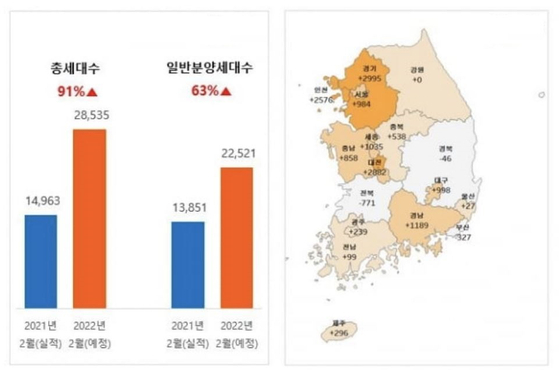 오는 3월 대통령 선거를 앞두고 2월 전국에서 2만2000여가구 규모 일반 분양 물량이 풀릴 전망이다. 2월 7일 부동산 정보업체 직방이 공개한 2월 분양 물량 조사 결과에 따르면 전국 47개 단지에서 총 2만8535가구를 공급할 예정이다. 이 가운데 일반 분양 물량은 2만2521가구다. 지난해 같은 기간과 비교하면 전체 공급량은 91%(1만3572가구), 일반 분양은 63%(8670가구) 늘어난 것이다.