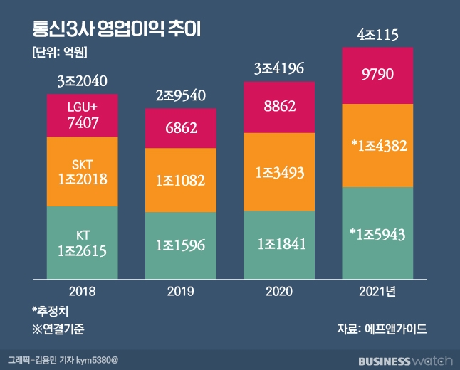 SK텔레콤과 KT·LG유플러스의 지난해 연간 합산 영업이익이 4조원을 넘으면서 역대 최대를 기록할 것으로 추정된다. 5세대(5G) 서비스 가입자 확대에 따라 통신 3사 실적이 나란히 개선되고 있기 때