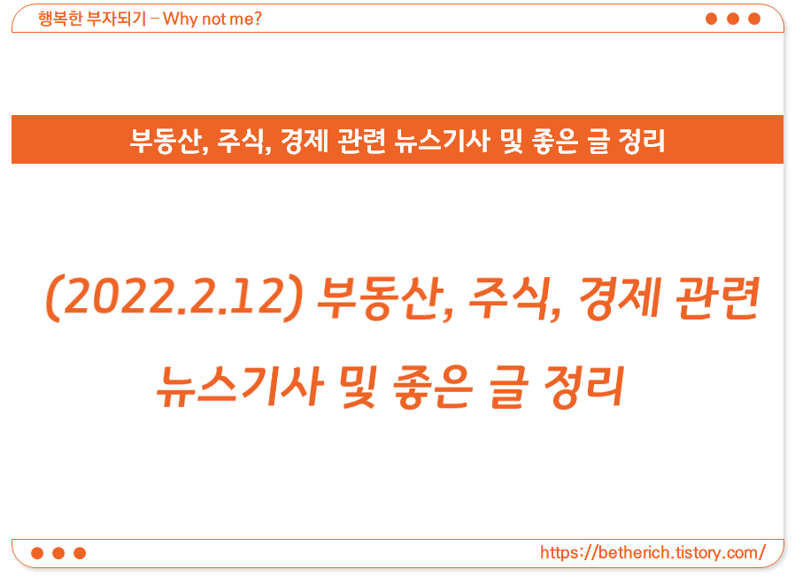 | (2022.2.11) 부동산, 주식, 경제 관련 뉴스기사 및 좋은 글 정리 (0) | 2022.02.11 |