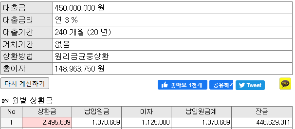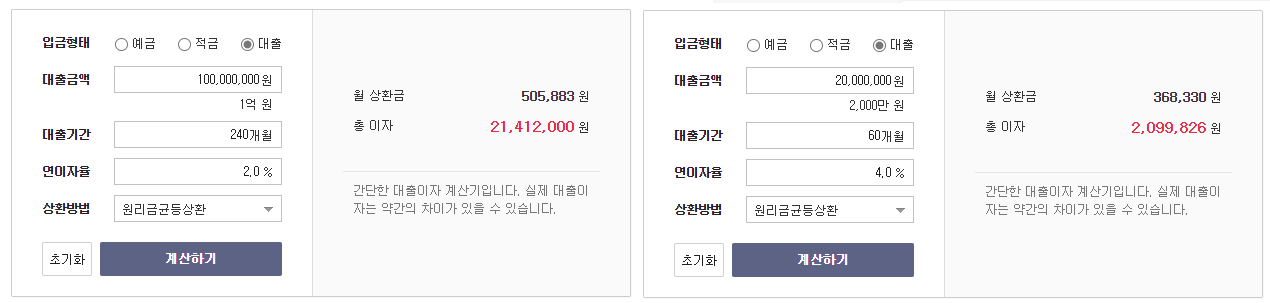 대략적으로 계산해 보겠습니다. 가장 먼저 연간부채 상환액을 구해야 하고, 연간부채 상환액은 (기존, 신규) 주택담보대출에 대한 원리금 상환액과 기타 부채의 이자 상환액을 합한 금액이라고 했습니다. 계산해 보겠습니다. 계산은 대출이자계산기로 했으며 관련 링크를 클릭하여 숫자를 입력하면 자동으로 계산됩니다.