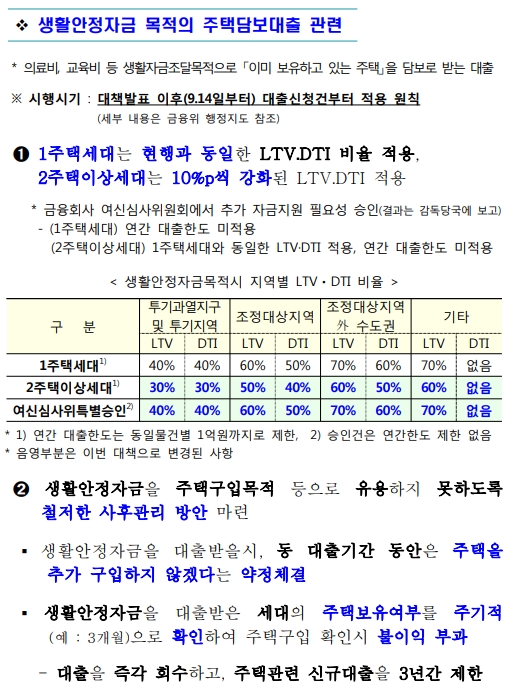 - 생활안정자금 목적의 주택담보대출은 생활자금조달목적으로 사용한다. 물론 구체적으로 어디에 어떻게 썼는지 증빙할 필요는 없지만 절대로 이 대출금으로 주택을 추가 매수하는데 사용하면 안 된다.