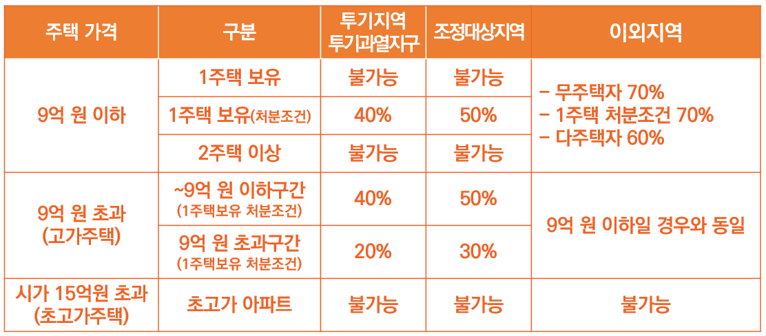 먼저 규제지역(투기지역, 투기과열지구, 조정대상지역)은 1주택자만 대출을 받을 수 있습니다. 대출한도는 지역에 해당되는 LTV와 전세보증금 중 낮은 금액을 받을 수가 있습니다. 그리고 비규제지역의 경우 다주택자도 가능합니다. 그리고 주택의 시세(KB시세)의 60%와 세입자 보증금 중 낮은 금액을 받을 수가 있습니다.