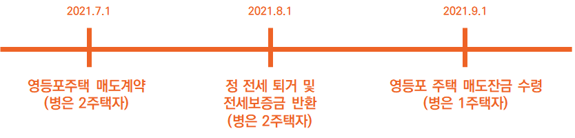 | 사례 4) 서울 영등포에 있는 시세 7억 원의 주택에 살고 있던 병이라는 사람은 서울 마포에도 12억 원의 주택을 가지고 있으며 해당 주택에는 정이라는 사람이 9억 원의 전세보증금을 내고 살고 있습니다. 병은 세금문제 등으로 인해 영등포 주택을 매도하고 마포 주택에 들어와서 살고자 합니다. 그리고 7월 1일, 영등포 주택에 대한 매도계약을 체결했고 매도잔금은 9월 1일에 받기로 했습니다. 그리고 병은 정에게 전세보증금을 돌려주기 위해 전세보증금 반환대출(전세퇴거자금대출)을 알아보고 있습니다. 물론 영등포 주택을 매도한 돈으로 전세보증금을 돌려주는 게 가장 깔끔합니다. 하지만 날짜가 잘 맞지 않습니다. 일단 마포 주택에 있는 정의 전세 퇴거날짜가 8월 1일이고, 영등포 주택의 매도잔금 시점은 9월 1일입니다. 이럴 경우 병은 전세보증금 반환대출(전세퇴거자금대출)을 받을 수 있을까요? |