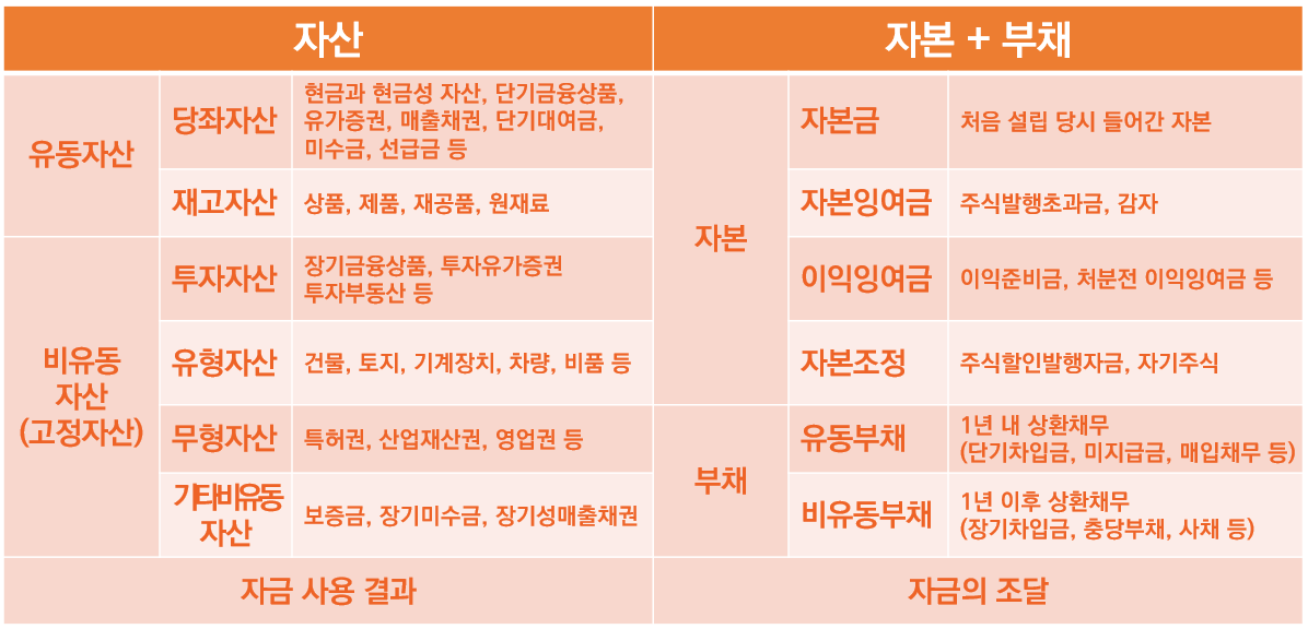 | 1. 자산 = 유동자산+ 비유동자산(고정자산) 1) 유동자산 = 당좌자산 + 재고자산 2) 비유동자산(고정자산) = 투자자산 + 유형자산 + 무형자산 + 기타비유동자산 2. 부채 = 유동부채 + 비유동부채 3. 자본 = 자본금 + 자본잉여금 + 이익잉여금 + 자본조정 |