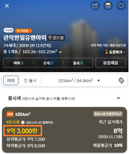 KB시세를 보면 9억 3천만원 정도 합니다. 해당 물건이 3층이기 때문에 일반가를 적용하여 받을 수 있는 대출금액을 예상해 보겠습니다.(일단 낙찰자 유00씨가 DTI와 DSR 기준을 충족시키고, MCI 등을 통해 방공제 없이 대출을 받을 수 있으며 2021년 7월 2일 이후에 대출을 실행한다고 가정하겠습니다.)