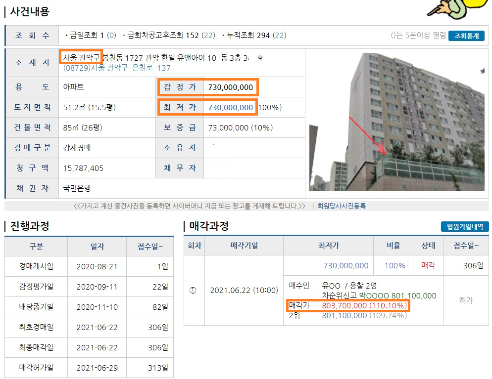 서울 관악구의 아파트가 경매로 나왔습니다. 3층입니다. 그리고 감정가는 7억 3천만원이고 매수인 유00씨가 8억 3,700만원에 낙찰받았습니다. 감정가의 약 110% 정도 됩니다. 등기부등본 권리분석이나 임차인 권리분석 등은 생략하고 대출을 얼마 받을 수 있을지 정도만 한 번 생각해 보겠습니다.