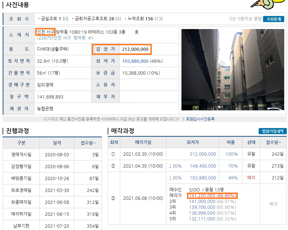 인천광역시 서구(투기과열지구)의 다세대(생활주택)이 경매로 나왔습니다. 감정가는 2억 1,200만원이고, 매수인 신00씨가 1억 4,120만원에 낙찰받았습니다. 일단 감정가의 66.60% 정도가 됩니다. 감정가보다 꽤나 낮은 금액에 낙찰이 되었는데 일단은 대출을 얼마 받을 수 있는지부터 한 번 살펴보겠습니다.(일단 낙찰자 신00씨가 DTI와 DSR 기준을 충족시키고, MCI 등을 통해 방공제 없이 대출을 받을 수 있으며 2021년 7월 1일 이후에 대출을 실행한다고 가정하겠습니다.)
