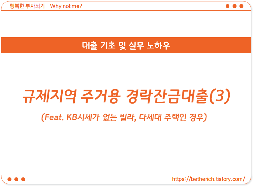규제지역 내 아파트와 마찬가지로 빌라, 단독주택, 다세대주택 또한 '주거용'이기 때문에 동일한 기준을 적용합니다. 단, KB시세가 있는 아파트와 달리 KB시세가 없을 경우는 '감정가'를 적용하여 진행한다는 점을 이해하면 될 것 같습니다.