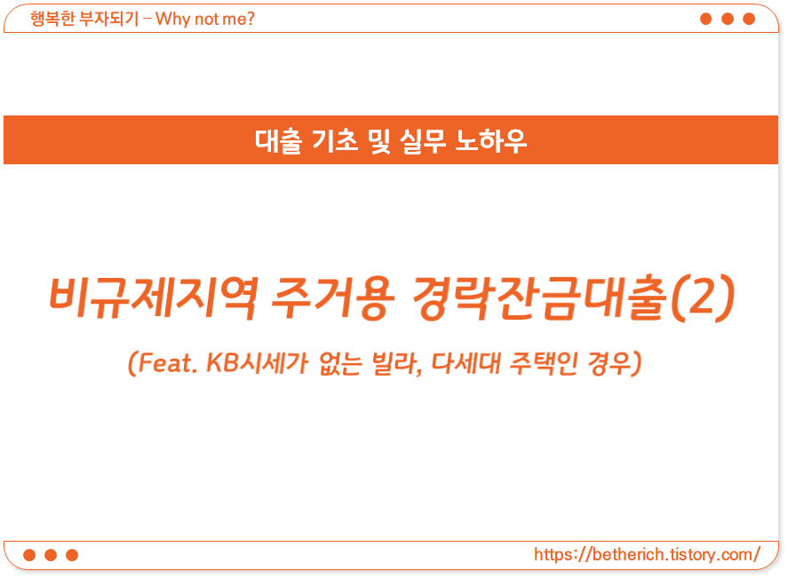 앞서 비규제지역 중 KB시세가 있는 아파트의 주거용 경락잔금대출에 대하여 공부했습니다. 그렇다면 비규제지역 내 KB시세가 없는 주택(빌라, 다세대, 단독주택 등)의 경우 어떻게 경락잔금대출을 받을 수 있는지 살펴보겠습니다.