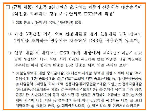 붙임 파일을 열어 내용을 한 번 보겠습니다. 일단 규제 내용을 보면 연소득 8천만원을 초과하는 차주의 신용대출 대출총액이 1억원을 초과할 경우 DSR규제를 적용하나,