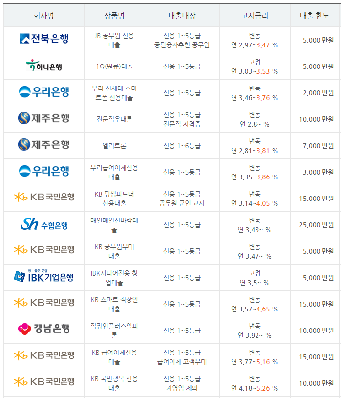 5천만원~1억 5천만원(수협은행의 경우 2억 5천만원)이라고 되어 있는데 저 금액을 Full로 받을 수 있는 것은 아닙니다. 보통 내 연봉 정도(연봉의 80%~100% 정도)를 받을 수 있다고 생각하면 될 것 같습니다. 만약 내 연봉이 3천만원 정도인데 1억 원 이상을 대출해 줄까요? 대략적인 한도는 내 연봉의 80~100% 정도라고 생각하면 될 것 같습니다. 그렇다면 2,400만원~3,000만원 정도를 받을 수 있을 것 같습니다. 하지만 단순하게 소득만으로 결정되는 것이 아니며 내 신용등급, 근속연수, 기업의 안정성, 전문직 여부 등을 따져 최종 한도가 결정된다고 합니다. 은행 홈페이지를 통해 알아보면 다양한 상품들(금융기관 재직자 전용 / 교사 및 공무원 전용 / 의사 등 전문직 전용)이 많이 있으며 아무래도 이런 상품들은 대출한도가 보다 높고 금리는 보다 낮습니다.