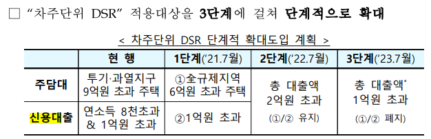 2021년 7월 1일부터는 투기지역, 투기과열지구, 조정대상지역 내에서 6억 원 초과의 주택을 구입할 때 주택담보대출을 받거나 1억원 초과의 신용대출을 받을 경우 DSR을 적용한다고 합니다. 그리고 2022년 7월 1일부터는 주택담보대출 등을 비롯, 모든 대출액이 2억 원을 넘어갈 경우 DSR을 적용받고, 2023년 7월부터는 총 대출액이 1억 원을 넘어가면 DSR을 적용받는다고 합니다. 쉽게 이야기해서 2021년 7월 1일부터는 신용대출을 많이 받거나 6억 원 초과 주택을 구입할 경우 DTI가 아니라 DSR을 적용해서 대출한도를 줄여버리겠다는 의미입니다. 즉, 1억 원 이상 신용대출을 받을 경우 주택담보대출을 받기 힘들도록 만들어 놓았다는 의미입니다.