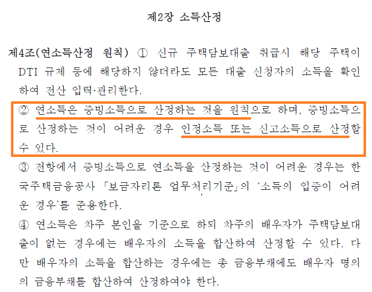 일단은 크게 연소득은 '증빙소득'으로 산정하는 것이 원칙이나 증빙소득으로 산정하기 어려울 경우 인정소득 또는 신고소득으로 산정할 수 있다고 되어 있습니다.