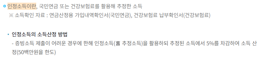 이어서 인정소득입니다. 증빙소득 제출이 어려운 경우에 한해 활용이 가능하며 연금산정용 가입내역확인서(국민연금), 건강보험료 납부확인서(건강보험료) 등으로 증빙할 수 있는 국민연금이나 건강보험료를 활용해 추정한 소득이라고 합니다.