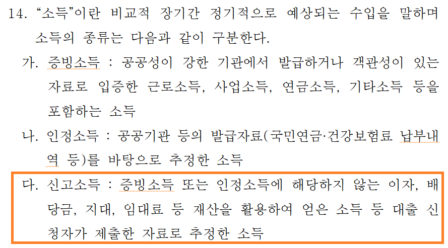 앞서 증빙소득과 인정소득에 대하여 공부했습니다. 이어서 신고소득을 한번 알아보겠습니다. 은행연합회 '여신심사 선진화를 위한 모범규준'제1장 제2조제14호다목을 확인해 보니 이런 구절이 있습니다.