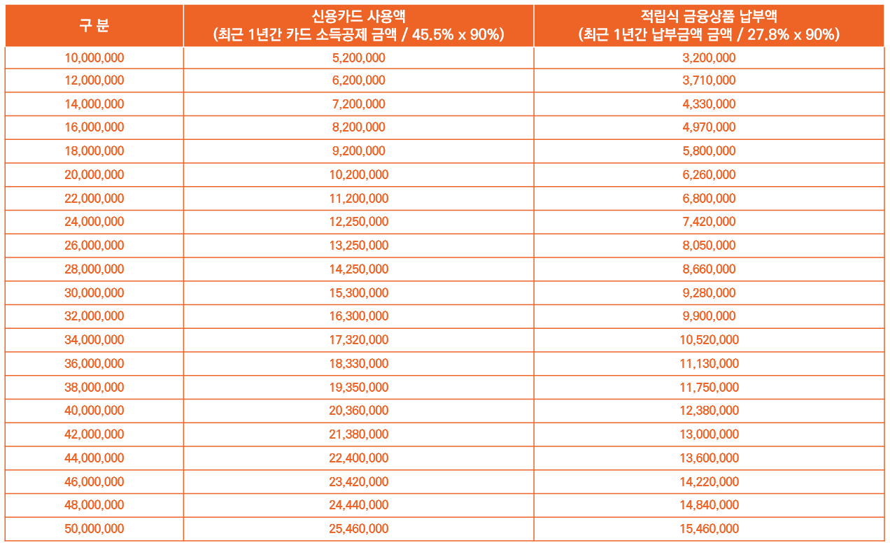 이런 식으로 카드사용액, 적립식 금융상품 납부금액을 통해서도 소득을 추정할 수 있으며 이것을 '신고소득 환산표'로 만들어보면 다음과 같습니다. (단, 정확한 계산은 아닌 만큼 참고만 하시기 바라며 필요할 경우 직접 계산해 보는 것이 좋습니다.)