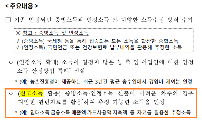 따지면 신고소득이란 증빙소득, 인정소득에 해당되지 않거나 증빙소득, 인정소득 산출이 어려울 경우 재산을 활용하여 얻은 소득 또는 다양한 관련자료를 활용하여 추정 가능한 소득을 의미한다고 할 수 있습니다.