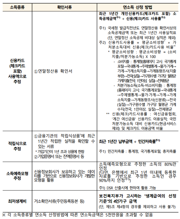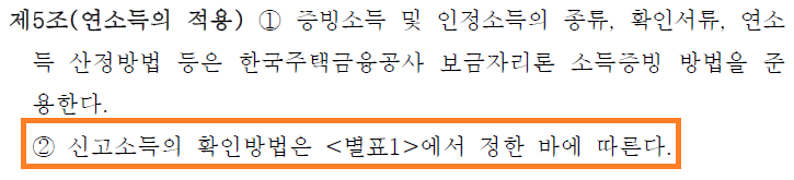 그리고 앞의 [별표1]을 보면 신고소득으로 연소득을 산정할 경우 또한 인정소득과 마찬가지로 최대 5,000만원까지가 한도라고 합니다. 만약 내가 신용카드 연간사용액이 25,460,000원을 초과했다고 해도, 적금을 연간 15,460,000원을 초과해서 납입한다고 해도 결국 최대 한도는 5,000만원까지라는 것을 알고 있으면 될 것 같습니다.