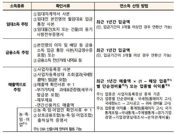 그리고 2021년 4월 29일 금융위원회에서 내놓은 '가계부채 관리방안-과제별 세부내용' 8p를 보면 신고소득의 예시 또한 나와 있습니다.
