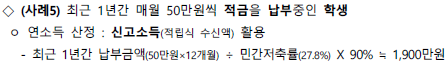 예를 들어 소득이 없는 학생이 매월 50만원씩 적립식 금융상품(정기적금 등)에 납입할 경우 해당 공식에 따라 1,900만원 정도로 소득을 산정할 수 있다는 의미입니다.
