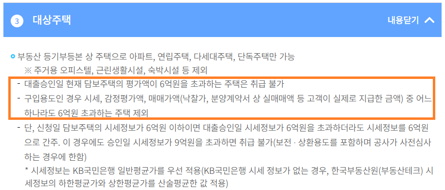 2. 대출 신청일 기준 KB시세, 감정평가액, 매매가 모두 6억 이하의 주택이어야 함