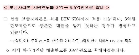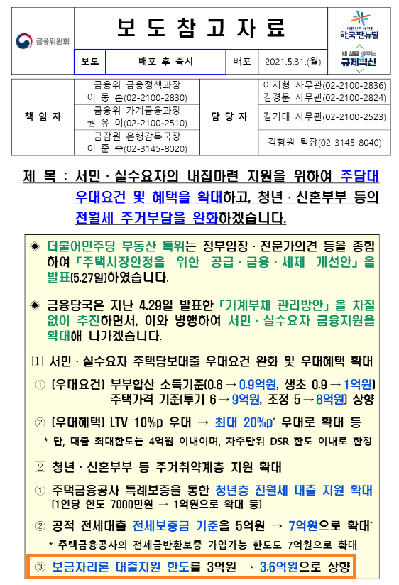 금융위원회에서 2021년 5월 31일에 배포한 보도참고자료를 보면 여러 가지 내용이 있습니다. 그 중에서도 눈에 띄는 한 꼭지가 바로 '보금자리론 대출지원 한도를 3억원→3억 6천만원까지로 상향했다는 것입니다.